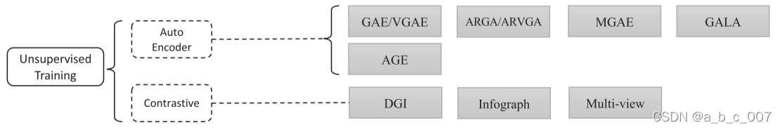 在本节中,我们将介绍不同训练设置的变体。对于监督设置和半监督设置,提供标签,以便易于为这些标记样本设计损失函数。对于无监督设置,没有标记样本,因此损失函数应取决于图形本身提供的信息,例如输入特征或图形拓扑。在本节中,我们主要介绍了无监督训练的变体,这些变体通常基于自动编码器或对比学习的思想。