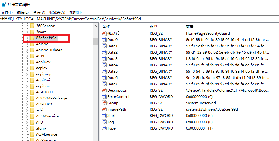 2、查看注册表路径:运行内,输入regedit,路径HKEY_LOCAL_MACHINE\SYSTEM\CurrentControlSet\Servies\83a5aef99d