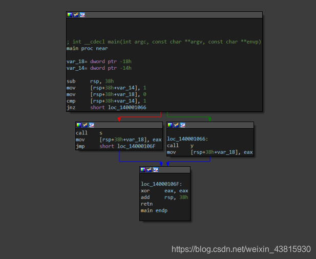 这次先介绍IDA-View,这其实就是一个程序逻辑图,IDA通常会把一个函数分成多个块,然后将块与块之间用蓝色、绿色、红色的线连起来,最后使得这些块与线就组成了完整的执行流。