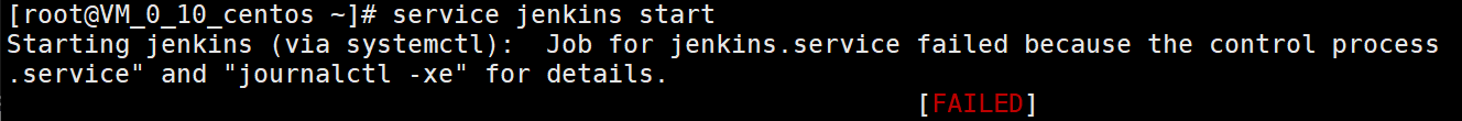 输入 service jenkins start,会有一个错误提示,Starting jenkins (via systemctl): Job for jenkins.service failed because the control process.service" and "journalctl -xe" for details.