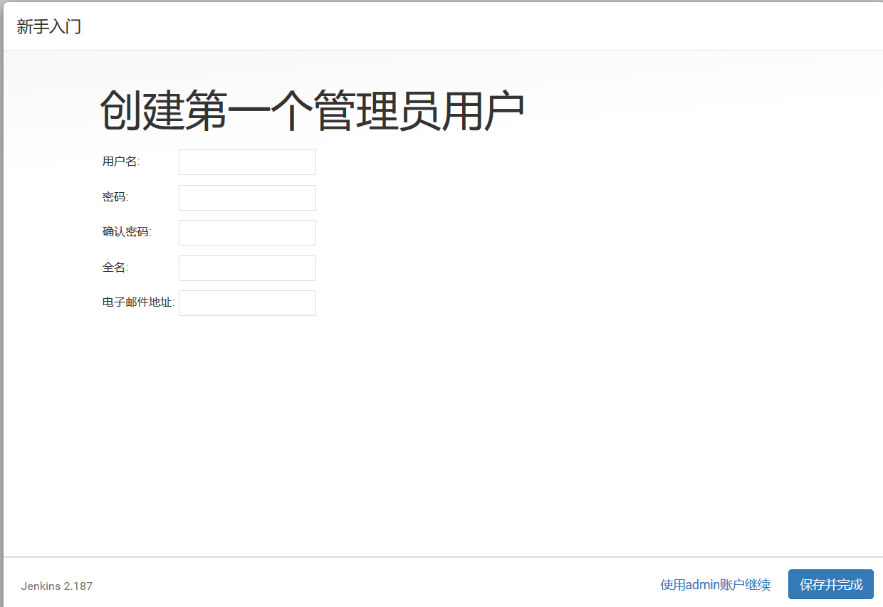 8.插件安装完成后,需要新建一个管理员账户(ps:此时可以用Jenkins默认管理员账户,但是不建议,因为不安全)