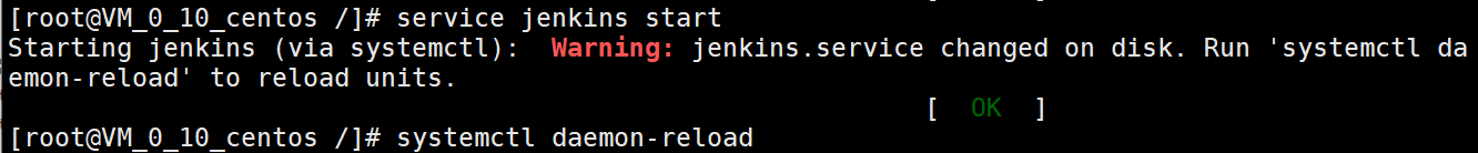 这只是一个警告,提示的是说Jenkins在磁盘上已经被修改了,需要执行一下systemctl daemon-reload,那么我们执行一下就OK了。其实这只是一个警告,忽略也是没关系的。