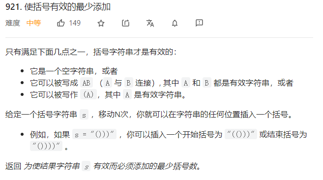 定义一个变量stack模拟栈,遇到左括号加1,遇到右括号减1,用来记录左右括号是否平衡,stack=0时即为平衡,遍历字符串,若在左右括号平衡(即stack=0)时遍历到右括号,说明该括号在之后一定无相匹配的括号,记录到变量remain中,依然认为左右括号平衡(即stack不变),最后stack与remain相加结果即为需要添加的括号数。