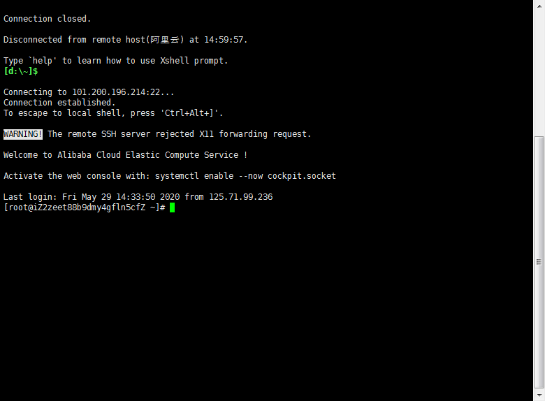 2、你需要配置好自己的阿里云账号密码,并在xshell中连上,远程主机是你自己的公网ip地址,并输入账号密码