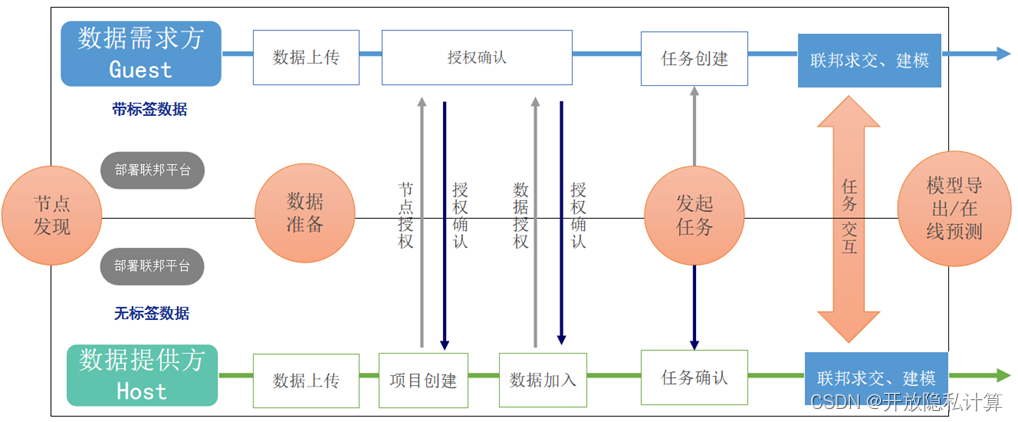 开展隐私计算数据合作业务的流程。开展一个场景合作,其涉及模式较多也较为复杂,但可将其分成两方——数据需求方和数据提供方。数据需求方称作Guest方,数据提供方称作Host方,二者通过联邦隐私计算平台进行信息交互和任务发起。双方开展隐私计算数据合作业务主要有四个流程