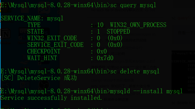 用【sc query mysql】命令查看完,再用【sc delete mysql】命令删除原有的