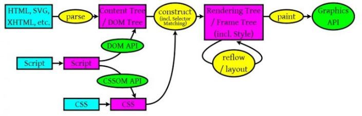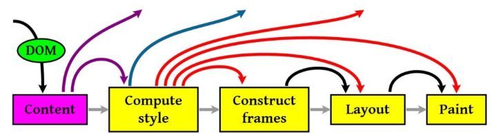 注意:上图流程中有很多连接线,这表示了Javascript动态修改了DOM属性或是CSS属性会导致重新Layout,但有些改变不会重新Layout,就是上图中那些指到天上的箭头,比如修改后的CSS rule没有被匹配到元素。