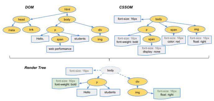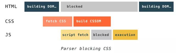 通常情况下DOM和CSSOM是并行构建的,但是当浏览器遇到一个不带defer或async属性的script标签时,DOM构建将暂停,如果此时又恰巧浏览器尚未完成CSSOM的下载和构建,由于JavaScript可以修改CSSOM,所以需要等CSSOM构建完毕后再执行JS,最后才重新DOM构建。