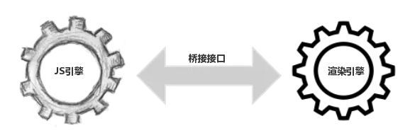 因为 DOM 是属于渲染引擎中的东西,而 JS 又是 JS 引擎中的东西。当我们用 JS 去操作 DOM 时,本质上是 JS 引擎和渲染引擎之间进行了“跨界交流”。这个“跨界交流”的实现并不简单,它依赖了桥接接口作为“桥梁”(如下图)。