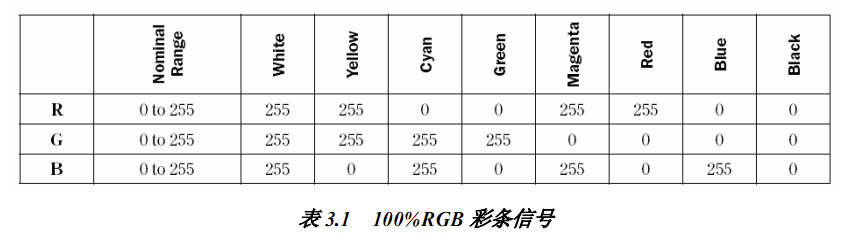 可以用三维的笛卡尔坐标系统来表示RGB颜色空间,如图3-1。而表3-1包含的RGB值具有100%的幅度、100%的饱和度,是8个标准的视频测试信号。