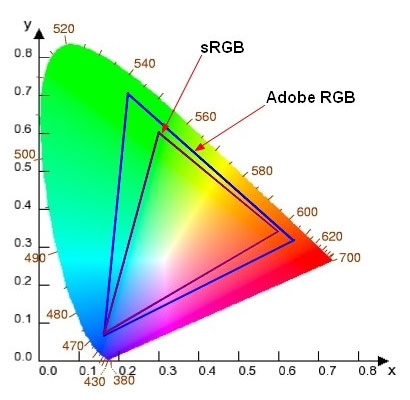 10年前,微软和惠普推出一个叫standard RGB的色域标准(sRGB),是一个基于32位PC机的标准。从上面的图片看到,它只是人眼能辨别的色彩空间(舌形色域)的一部分,人眼能辨别的好多色彩它都无法显示。但这个标准还是被广泛接受。我们现在在使用的显示器、扫描仪、打印机、数码相机,许多都使用这个标准。