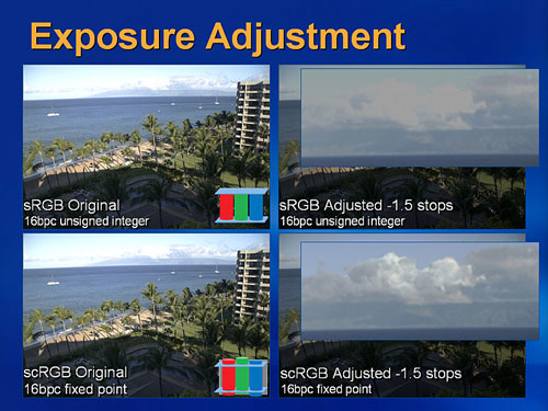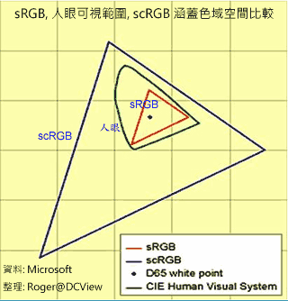2003年,微软又推出了scRGB色域标准,它大大拓展了色域范围,不仅全部复盖人眼可见的色域范围,还把空间扩展了很多。其16位的精度也大大超过8位的sRGB,从下面的图片中我们可以看到它们的区别。