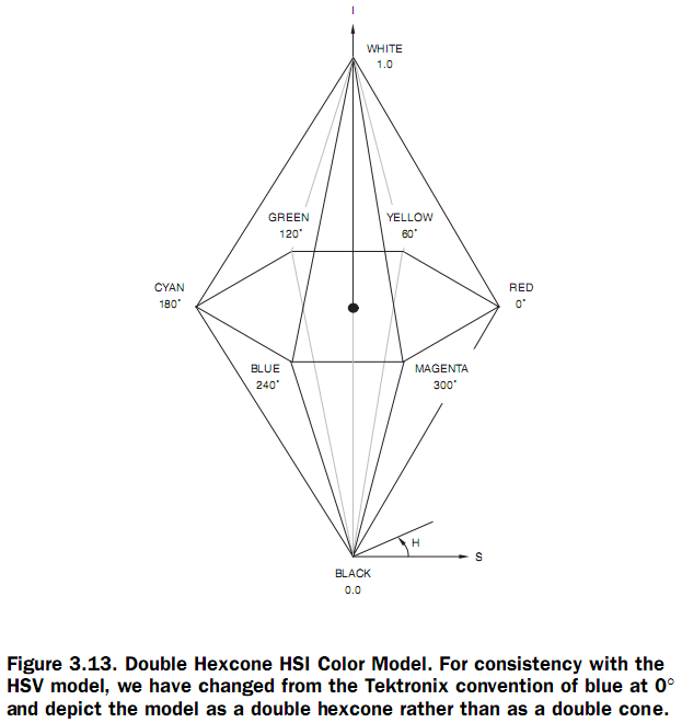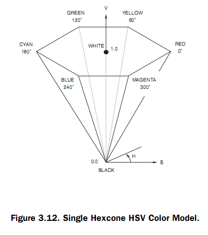 HSI (hue、saturation、intensity) 和HSV (hue、saturation、value) 颜色空间在设计上使得颜色感知和解释的方式与人很接近,在需要手动指定颜色值时经常需要使用它们。HLS (hue、lightness、saturation) 类似于HSI,只是使用了术语lightness,而不是光强度intensity来表示亮度。