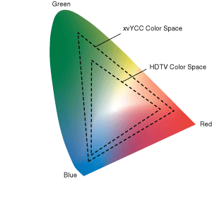 xvYCC颜色空间是对基本的YCbCr的色域进行扩展后得到的颜色空间,它使得颜色数目多了1.8倍。xvYCC规范使用BT.709色度标准和D65参考白色。scRGB和xvYCC颜色空间之间有公式可以相互转换。HDMI正在用色域边界描述元数据的方式传输xvYCC视频数据。