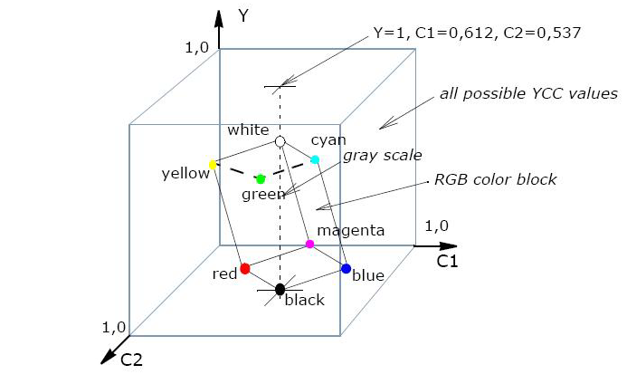 PhotoYCC是柯达公司的一个商标,是为了对Photo CD图像数据进行编码开发的颜色标准。目的就是要建立一个与现实设备无关的颜色空间。PhotoYCC和RGB颜色空间之间可以通过公式进行转换。它的颜色模型如下图: