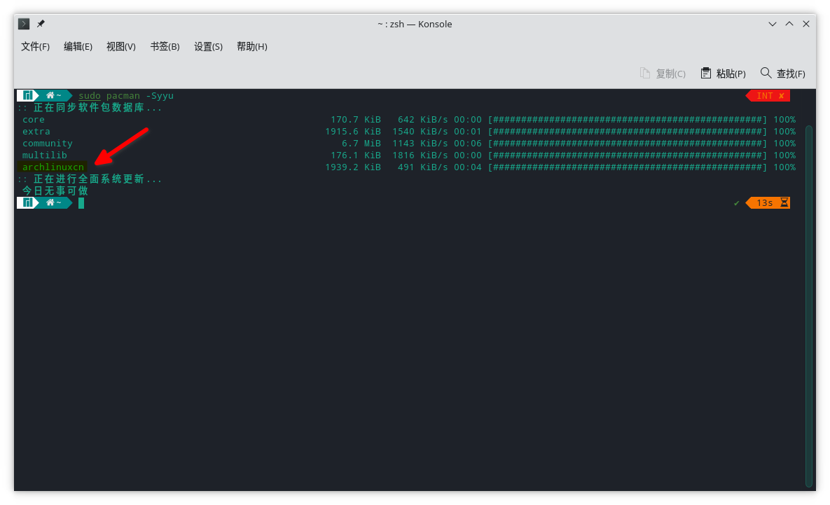 sudo pacman -Syyu可以看到多了一个 archlinuxcn 表示archlinuxcn添加完成啦