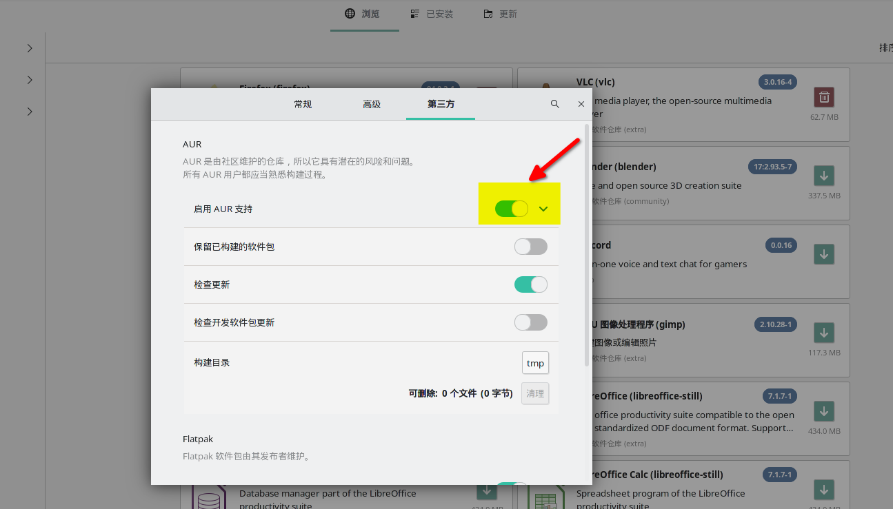 打开 添加/删除软件 这个软件,类似应用商店,打开 首选项 打开 aur
