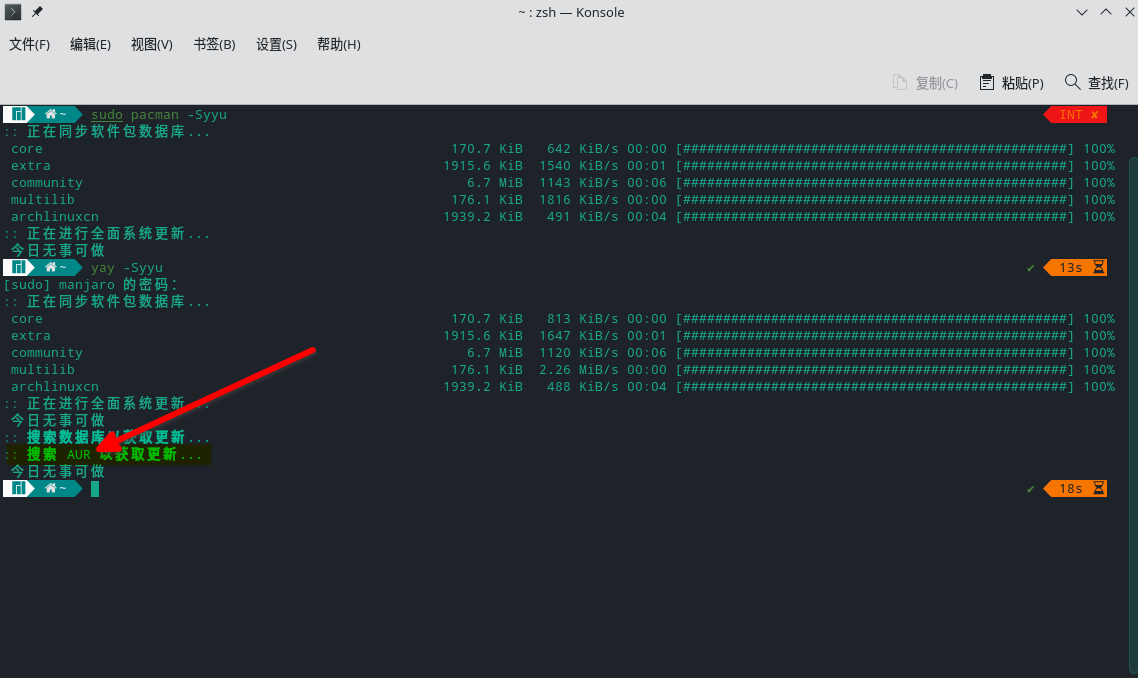 yay -Syyu可以看到 搜索 AUR 以获取更新...,表示aur也添加完成啦