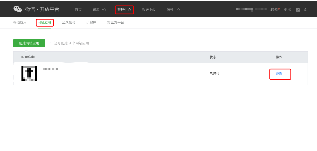 1 登录微信开放平台(开放平台、开放平台、开放平台)进入管理中心 -> 网站应用->