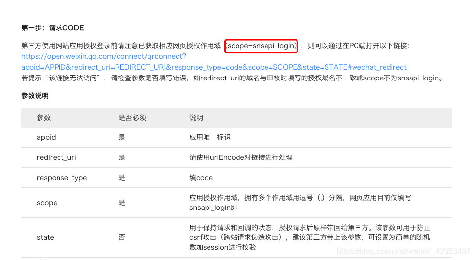 https://open.weixin.qq.com/connect/qrconnect?appid=APPID&redirect_uri=REDIRECT_URI&response_type=code&scope=snsapi_login&state=STATE#wechat_redirect注:使用时请将appid和redirect_uri修改为你开放平台的appid和设置的回调域名