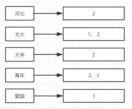 这样,当我们在程序发出一个查询请求后,比如“北大青年”。首先会把这个查询内容分词:“北大”、“青年”。然后就找到对应的数据[1,2,3]。这三条数据了,比我们在mysql中模糊查询快的多。这是其中的一个原因。