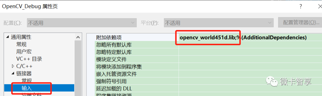 链接器中Debug这里填上opencv_world451d.lib,而Relese里就填opencv_world451.lib。