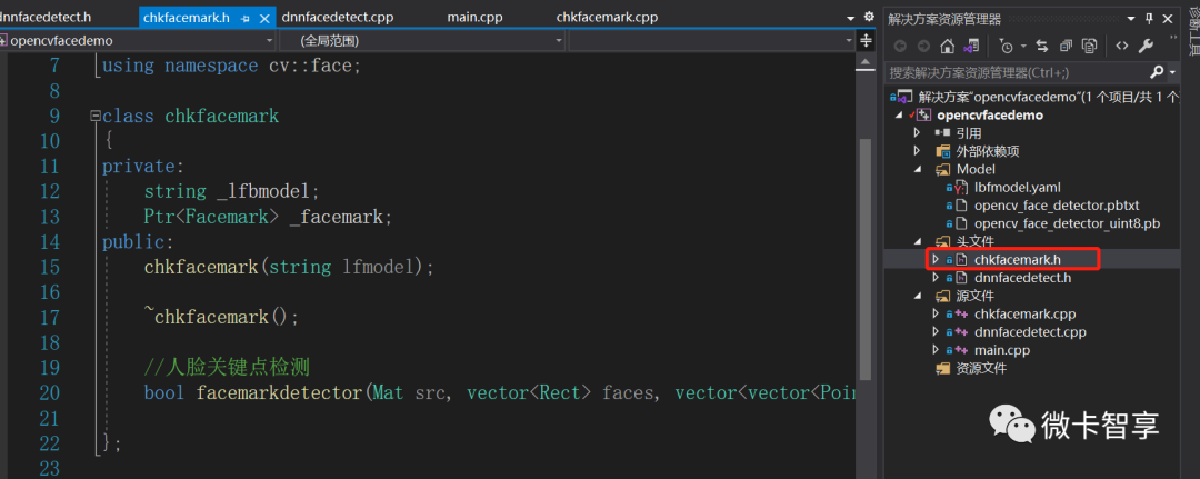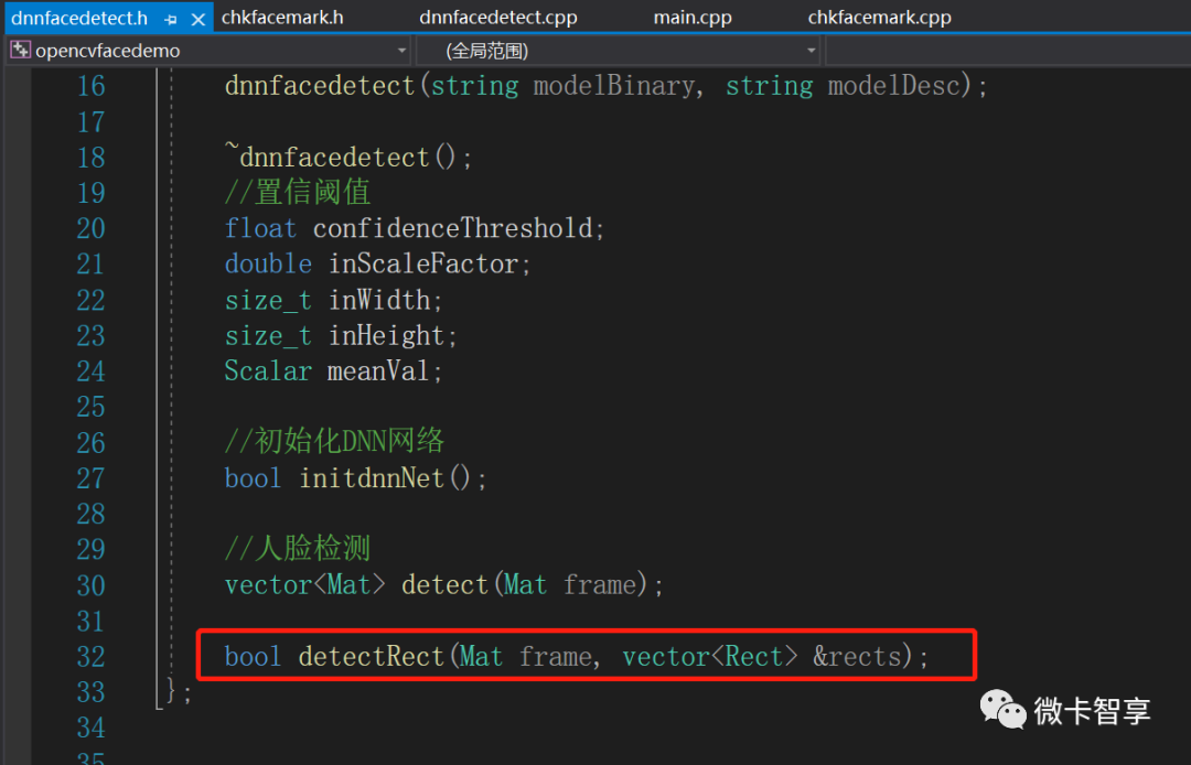 同《实践|OpenCV4.2使用DNN进行人脸检测一(图片篇)》文章中一样,已经把DNN的人脸检测单位写在一个类中