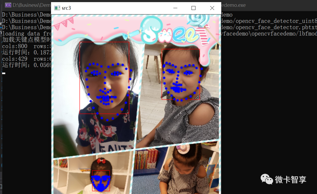 | 3 | 调用FaceMarkLBF中的fit针对Mat和上面获得的人脸矩形框进行特征点检测,检测的结果存放为vector<vector<Point2f>>格式。 |