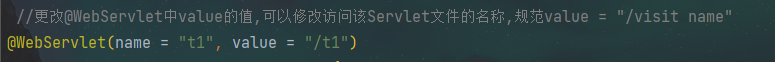 //更改@WebServlet中value的值,可以修改访问该Servlet文件的名称,规范value = "/visit name"