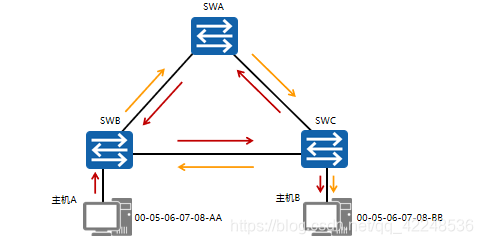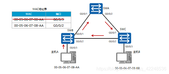 原理简述:交换机B从3端口收到主机A发送的单播帧,查找自己的MAC地址表项,没有发现转出的端口;交换机B会向其他端口泛洪这个帧,但是由于环路的存在,交换机B又会从自己的2端口接收到,由于交换机对MAC地址的自学习能力,所以MAC地址表项里关于该数据帧的内容会从3端口改变成2端口;此时交换机B会继续查找自己的MAC地址表项,没有发现,同样的泛洪出去,如此现象反复执行,会造成MAC地址表项中的对应端口内容一直在2端口和3端口之间变来变去的。