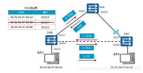 9、拓扑改变导致MAC地址表错误:在交换网络中,交换机依赖MAC地址表转发数据帧。缺省情况下,MAC地址表项的老化时间是300秒。如果生成树拓扑发生变化,交换机转发数据的路径也会随着发生改变,此时MAC地址表中未及时老化掉的表项会导致数据转发错误,因此在拓扑发生变化后需要及时更新MAC地址表项。