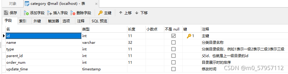 category目录表:包括主键id、name、type(手机电脑是一级目录、品牌是二级目录、型号是三级目录)、parent_id、order_num(展示时的排序)五个属性;
