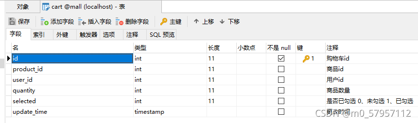 cart购物车表:包括主键id、product_id、user_id、quantity(数量)、selected五个属性;