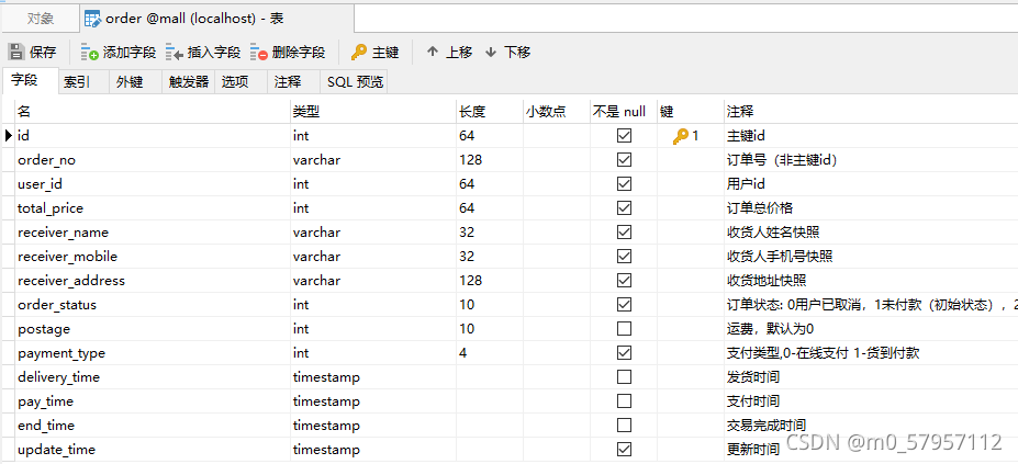 order订单表:包括主键id、order_no(订单号非主键id,varchar型,不对外开放)、user_id、total_price、receiver_name(收货人名字)、receiver_mobile、receiver_address(地址)、order_status、postage(运费)、payment_type、delivery_time(发货时间)、pay_time、end_time
