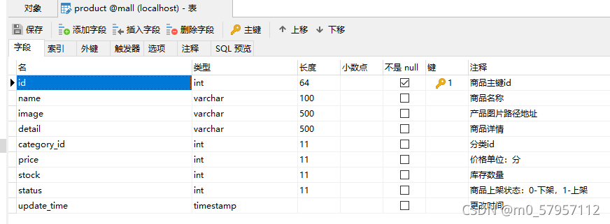 product商品表:包括主键id、name、image(图片路径地址)、detail(详情)、category_id(分类id)、price、stock(库存)、status(上架状态)八个属性;