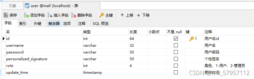 user用户表:包括主键id、username、password、personalized_signature(个性签名)、role(角色)五个属性;