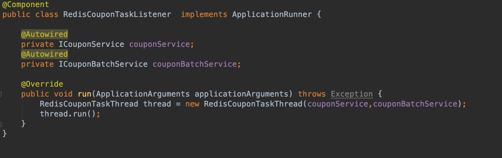 2、对于监听器,要求项目一启动就开始运行,那么就用到了SpringBoot的ApplicationRunner这个类,此类执行的时机是容器启动完成的时候,这个接口中有一个run方法,实现类在此run方法开启生成优惠券的进程即可。
