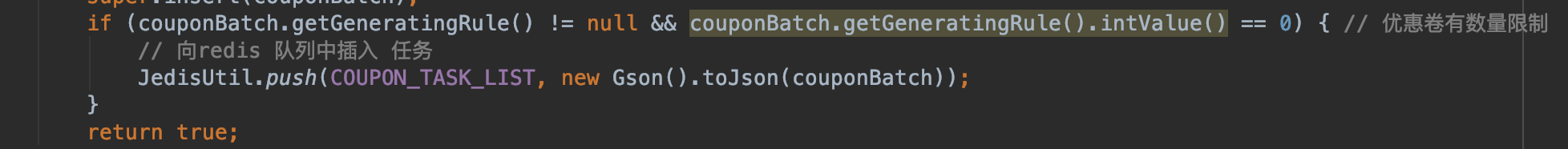 所有人都能想到的一点就是另外开启一个线程来专门用于优惠券插入操作,而当前线程只需给当前操作成功即可,如果另一个构造优惠券的线程插入过程发生异常,那么可以给用户发邮件等提示操作。怎样用一种很好的机制去是实现这一种协同操作呢?没错,就是redis队列以及监听器的合作。把当前优惠券批次信息存入redis队列,另一端监听器一直监听该队列,一旦发现队列有批次信息键值对,那么立即在监听器那个线程循环生成优惠券。