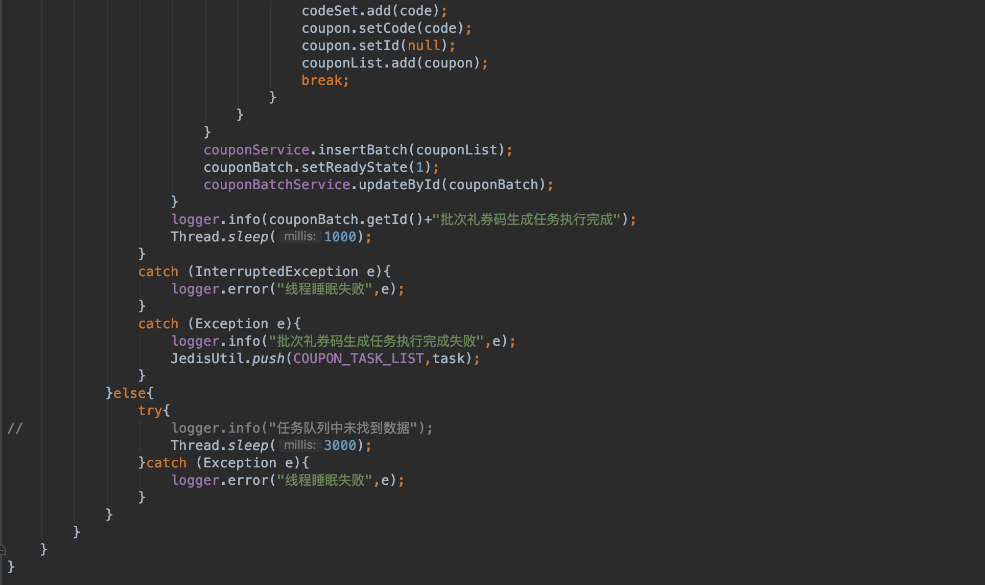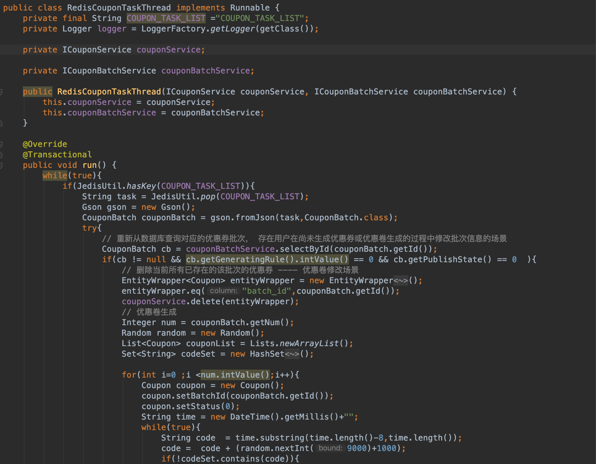 这个线程自Spring容器初始化完成后就被ApplicationRunner这个类唤醒了,并且一直运行,一旦发现redis队列中有CouponTaskList这个键,就把这个键的value弹出,也就是优惠券批次对象,从而进行该批次的一些操作。