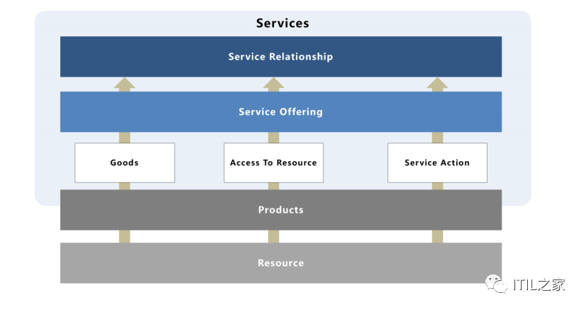 这是一个很好的模型,能让我们清晰理解自己的服务组成,怎么借助资源(Resouce)形成产品(Product,笔者认为这里应该是Product & Service会更容易理解),基于这些产品,以实物货品(Goods)、资源访问(AccessToResource)、服务行为(ServiceAction)的组合进行服务的提供(Service Offering),最终达成预期的服务关系(Service Relationship)。这里采用了很好的产品思路来形成模型,目前许多组织,无论甲方还是乙方,如何服务产品化是有困惑的,这个困惑其实是可以通过ITIL4的建议来尝试解决的。我们可以尝试实现一个“某部门的桌面支持”这么一个服务关系实现。