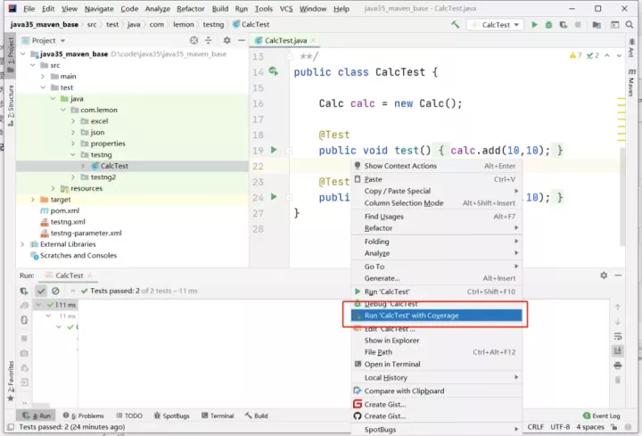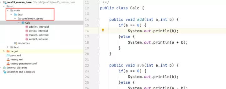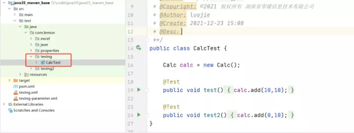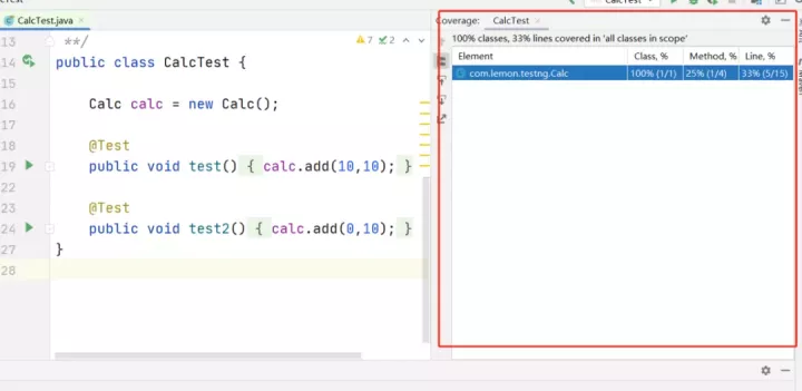 注意:单元测试类(CalcTest)必须和被测类(Calc)在同一个包下(com.lemon.testng)