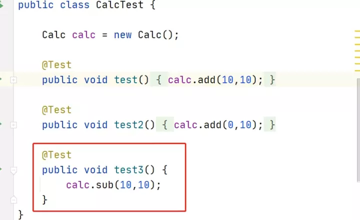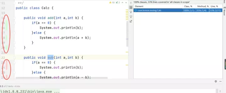 单元测试用例主只写了 add 方法,所以 add 方法显示绿色,覆盖状态,sub 方法显示红色,未被覆盖。
