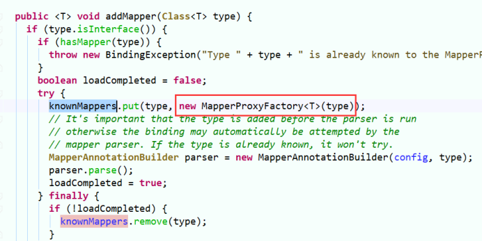 MapperRegistry.addMapper将代理工厂存入configuration.mapperRegistry.knownMappers中(以class对象为key,代理工厂对象为value)