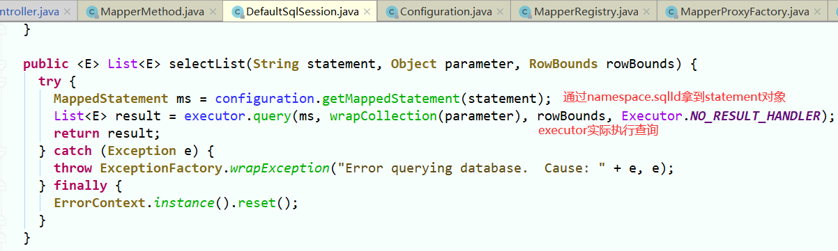 DefaultSqlSession.selectList() 查询单条/多条数据最终执行都是执行selectList方法 从configuration.mappedStatements获取到statement对象后,使用executor代理(默认SimpleExecutor+BaseWExecutor/开启二级缓存CachingExecutor)实际执行sql
