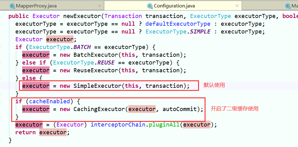 BaseExecutor.query() 未开启二级缓存/二级缓存未获取到,则从一级缓存或DB中查询。 一级缓存对象localCache是executor的成员变量。而从executor(SimpleExecutor)的创建过程可以看出,每次sessionFactory.openSession()都会new一个executor对象。因此每次openSession()都是使用新的一级缓存对象,即一级缓存是sqlsession级别的缓存。