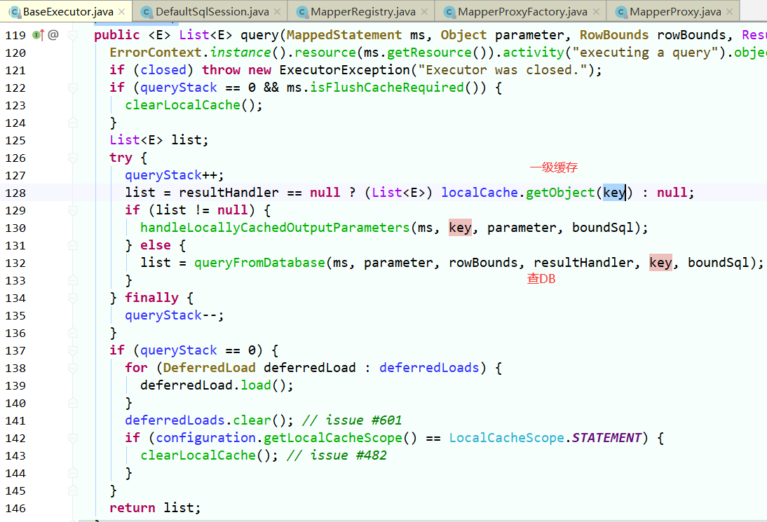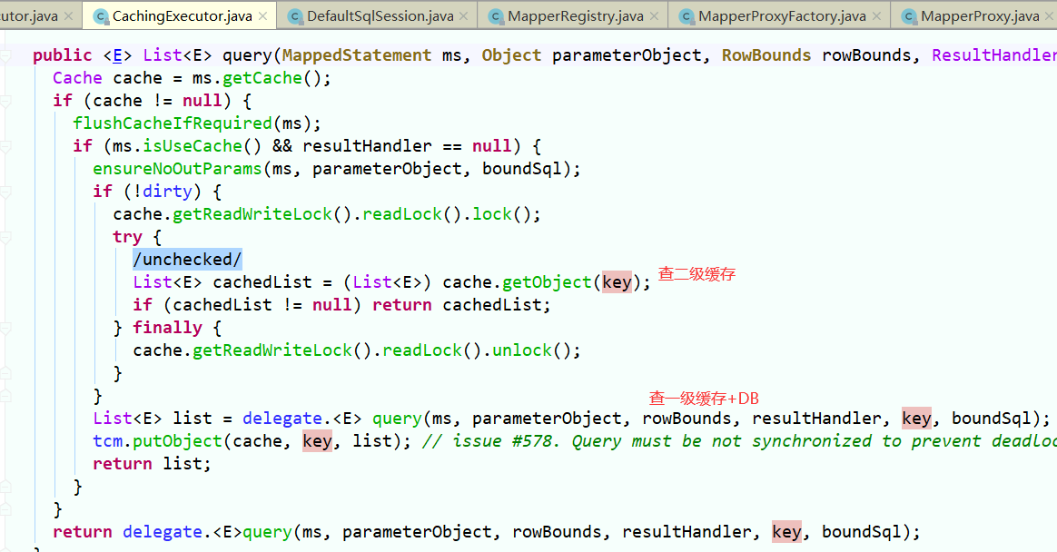 CachingExecutor.query() 先从缓存获取,缓存没有从db查询。此缓存为mappedStatement(configuration.mappedStatements / namespace)级别的缓存,又称二级缓存。二级缓存为全局namespace级别缓存,不同sqlsession会话可共用。