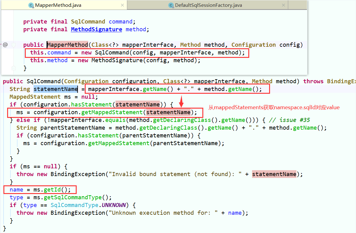 1、通过解析mybatis-config.xml及sqlMapper.xml文件,保存以namespace+sqlId为key、mappedStatement为value的Map(configuration.mappedStatements);保存以namespace的class对象为key、MapperProxyFactory代理工厂为value的Map(configuration.mapperRegistry.knownMappers)。