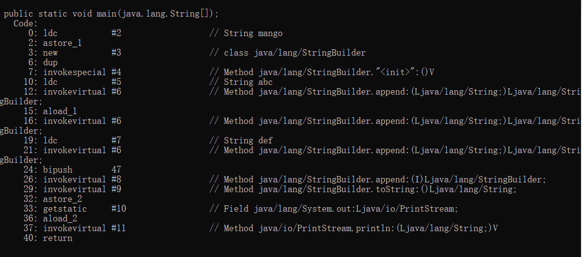 1、String在拼接时,自动的使用Stringbuilder的append方法,提高效率。dup和invokevirtual时Java的汇编语言。从而看出,String在拼接的时候不是直接放到后面的,而是创建了一个StringBuilder对象;