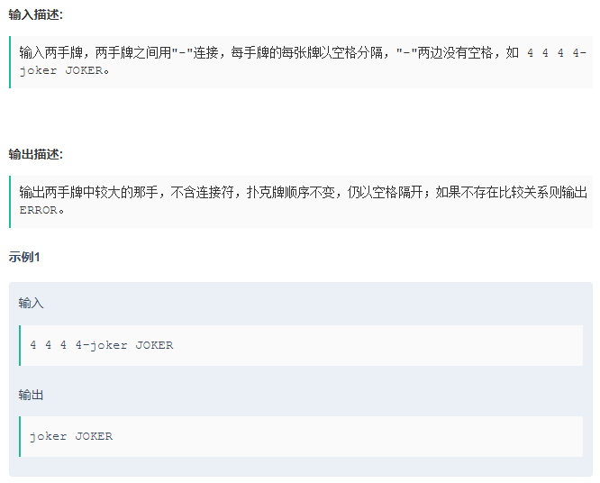 用 String 的 split() 方法分割输入的字符串,先考虑最大的王炸情况,再考虑 炸弹(4张) 的情况,最后考虑长度相等牌组之间的比较,其中的特殊情况就是 2 了,然后我通过对牌组第一个元素重新赋值的方式再通过 Integer.parseInt() 中的进制转换的方法来比较大小,其余情况就都返回 ERROR 。调试了很久终于通过了所有用例。