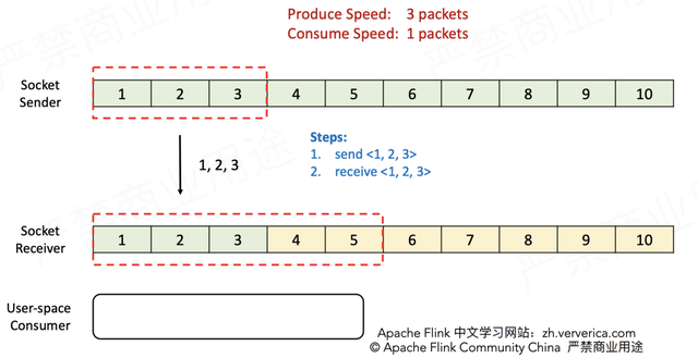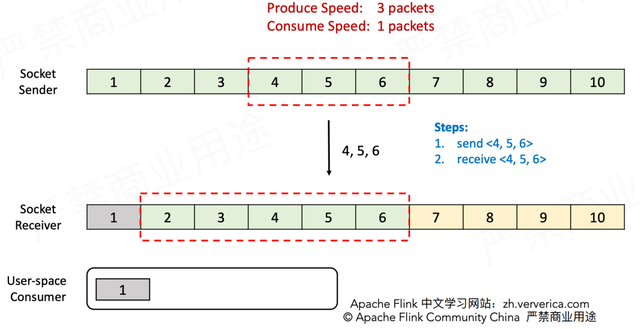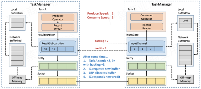 也就是说,Sender和Receiver通过互相告知对方自己的处理能力的方式来精准地进行流控(注意backlog size和credit也是要通过传输层的,不是直接交换的)。接下来仍然通过实例来说明基于Credit的流控和反压流程。